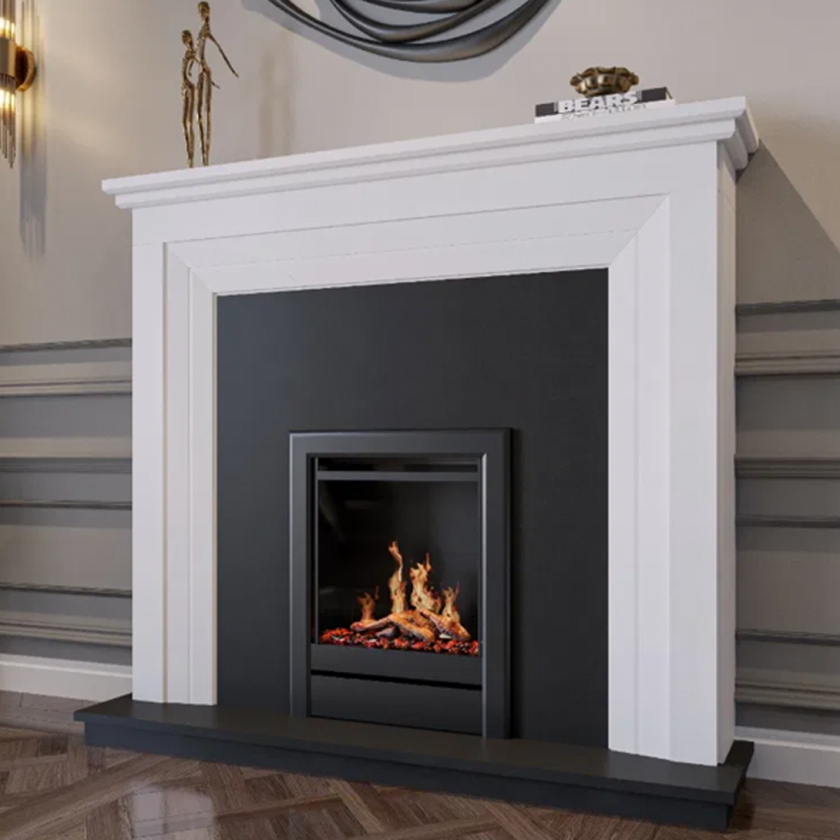 The 56” Salento 75 fireplace in Alpine White Marble Polished features layered detailing and a double-layered mantelpiece. This fire surround with a 3” rebate adds a refined touch of luxury, blending modern design with timeless elegance.