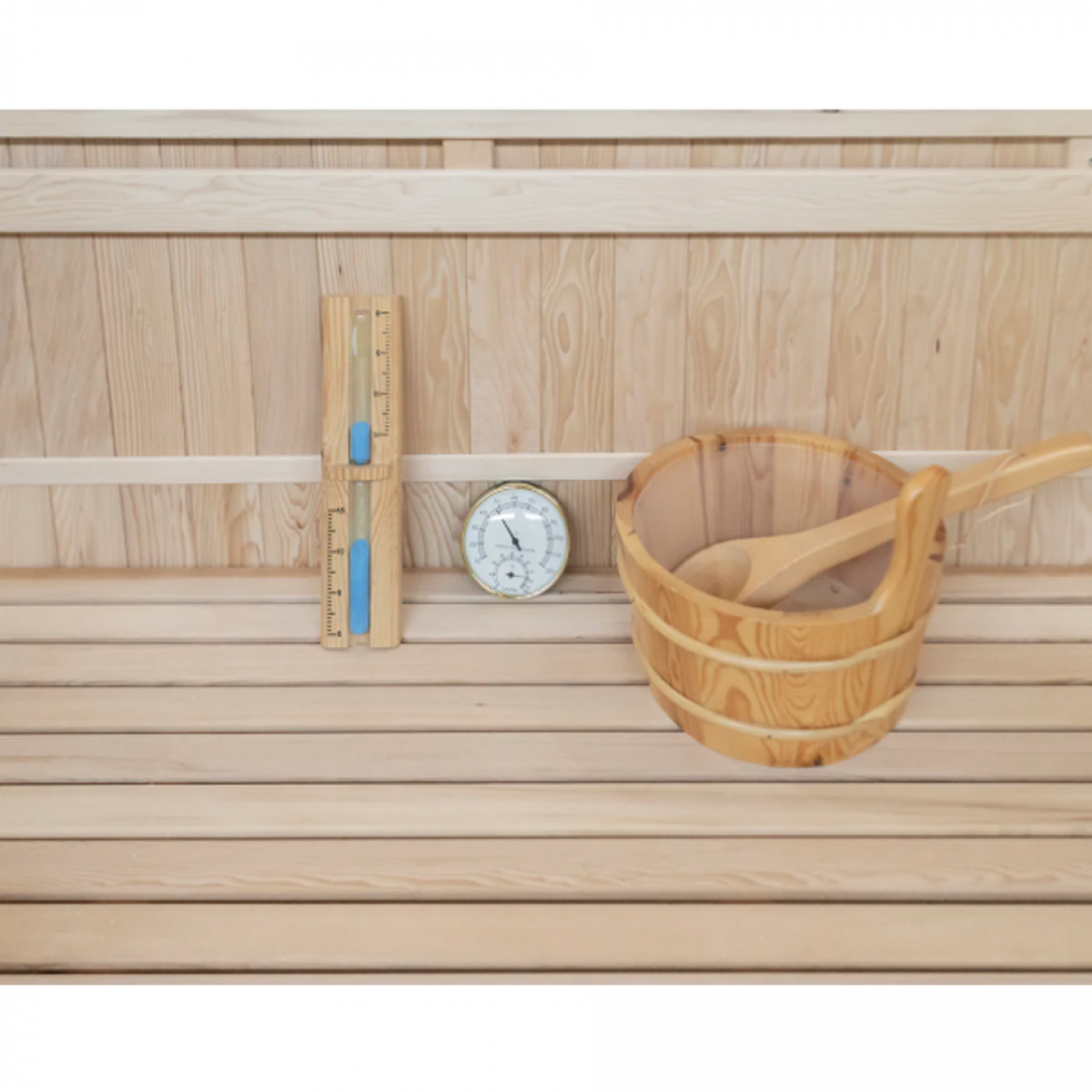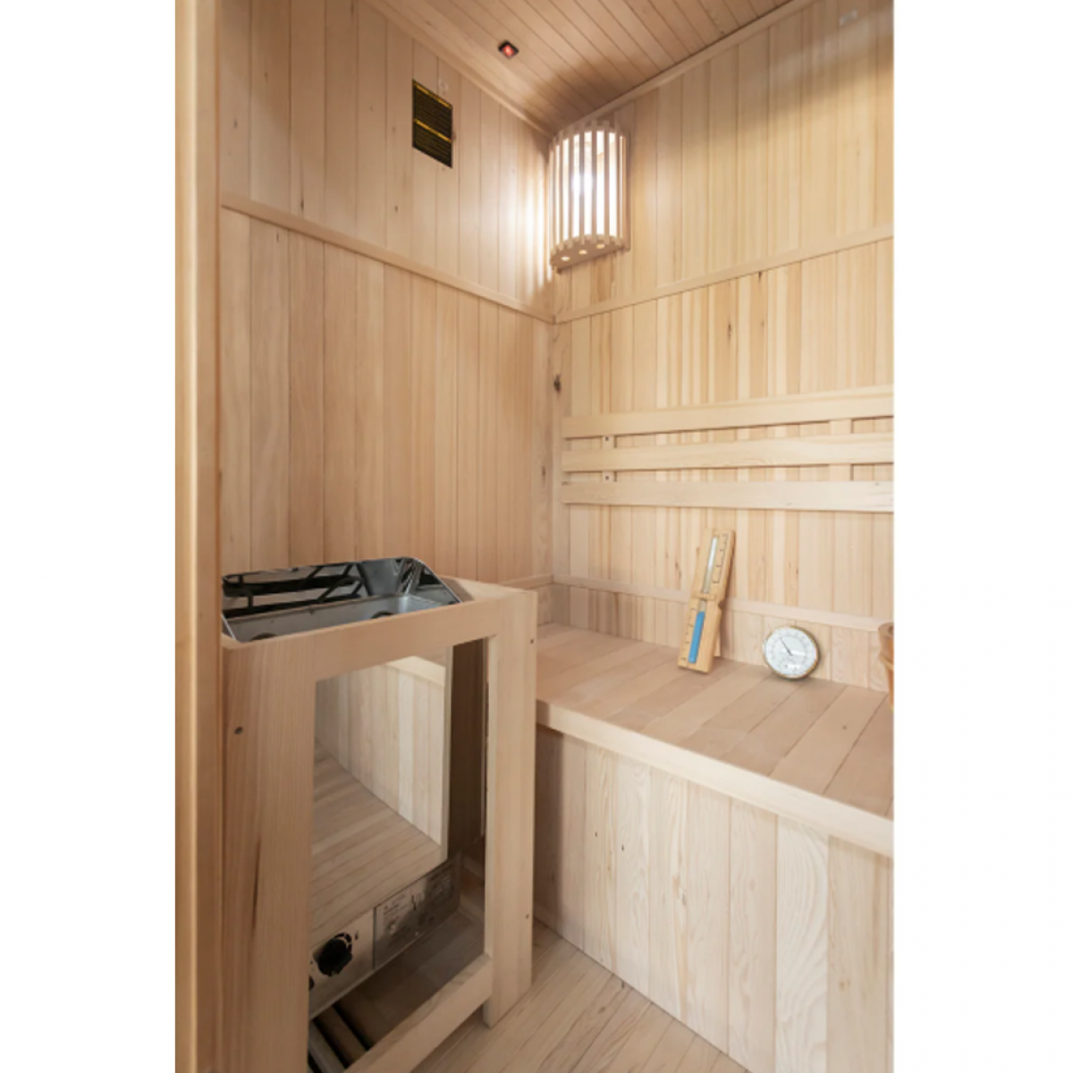 The interior is crafted from premium Canadian hemlock, selected for its durability, natural resistance to heat, and calm, Nordic-inspired appearance.