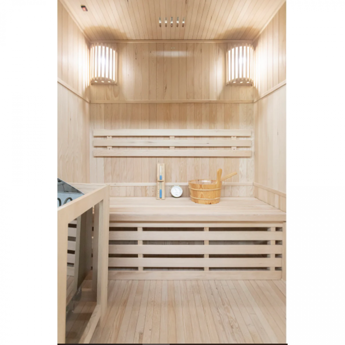 The interior is crafted from premium Canadian hemlock, selected for its durability, natural resistance to heat, and calm, Nordic-inspired appearance.