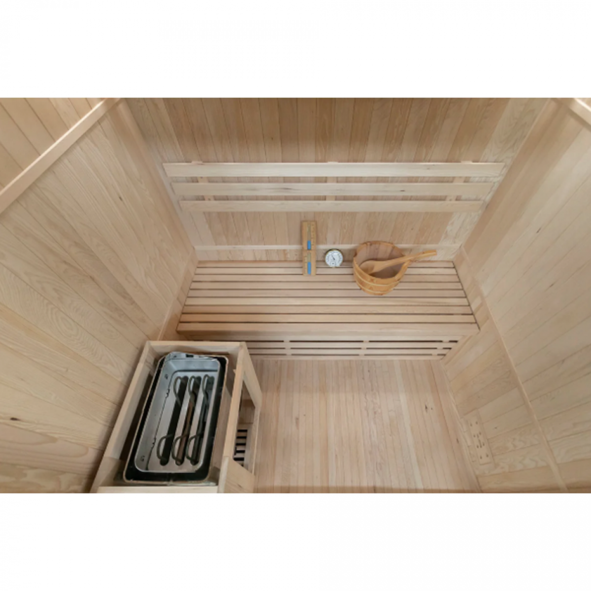 A classic electric sauna stove filled with heated stones allows water to be poured over them to create löyly — the soft burst of steam that defines the traditional sauna experience and lets you fine-tune humidity and intensity.