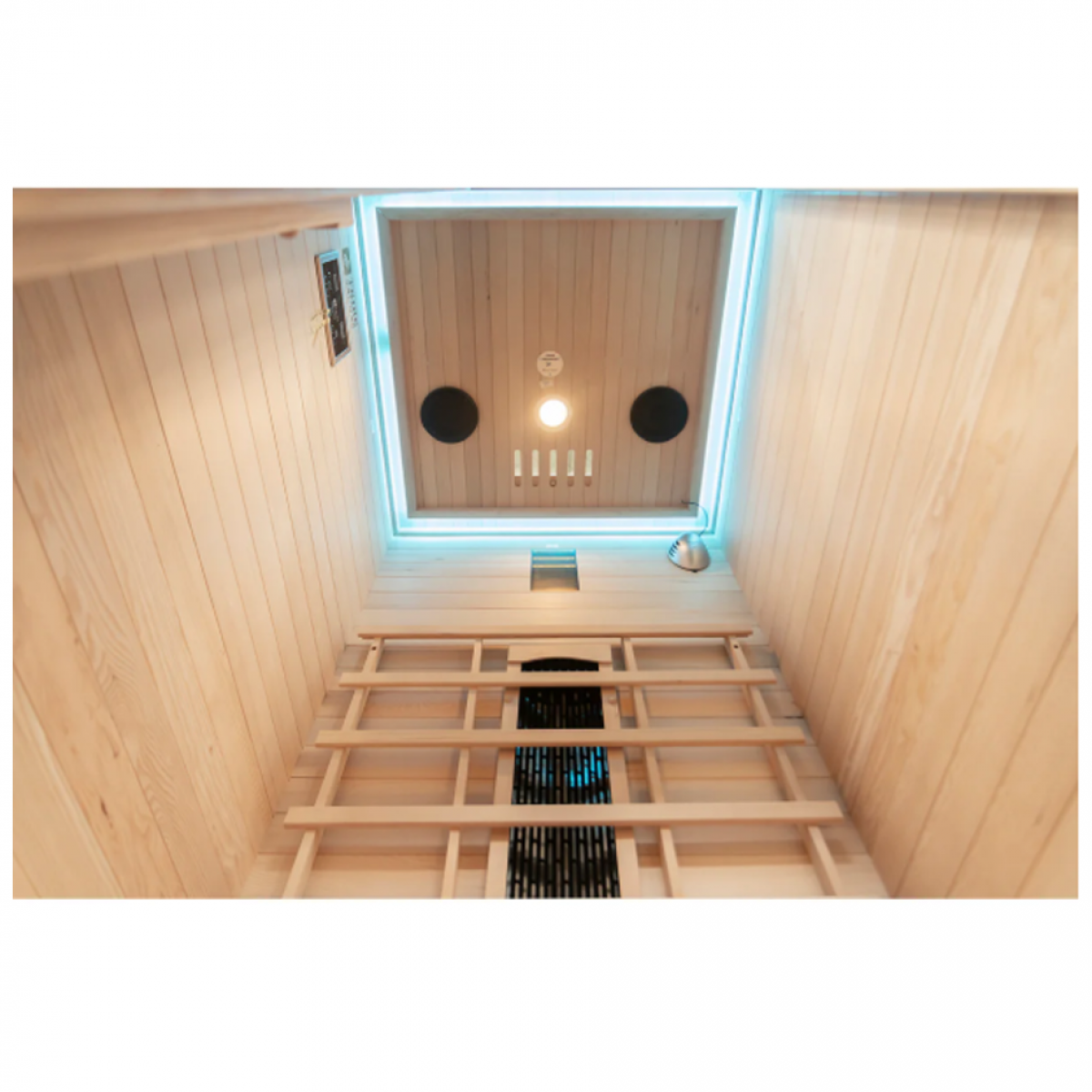 7-colour LED lighting and an integrated FM/Bluetooth audio system enhance the sauna experience.